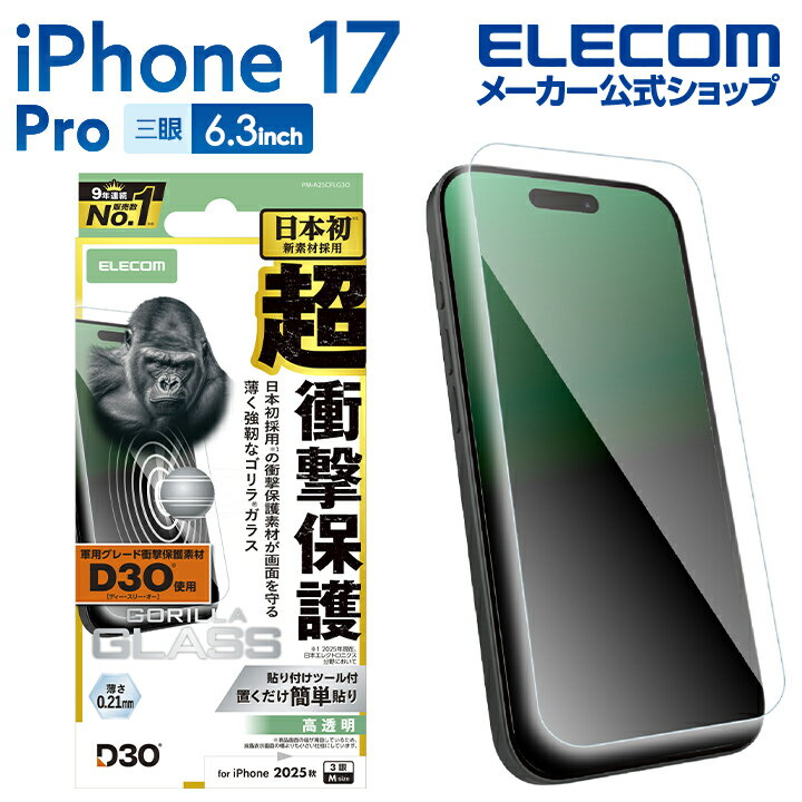 エレコム iPhone 17 Pro 用 ガラスフィルム D3O ゴリラ..